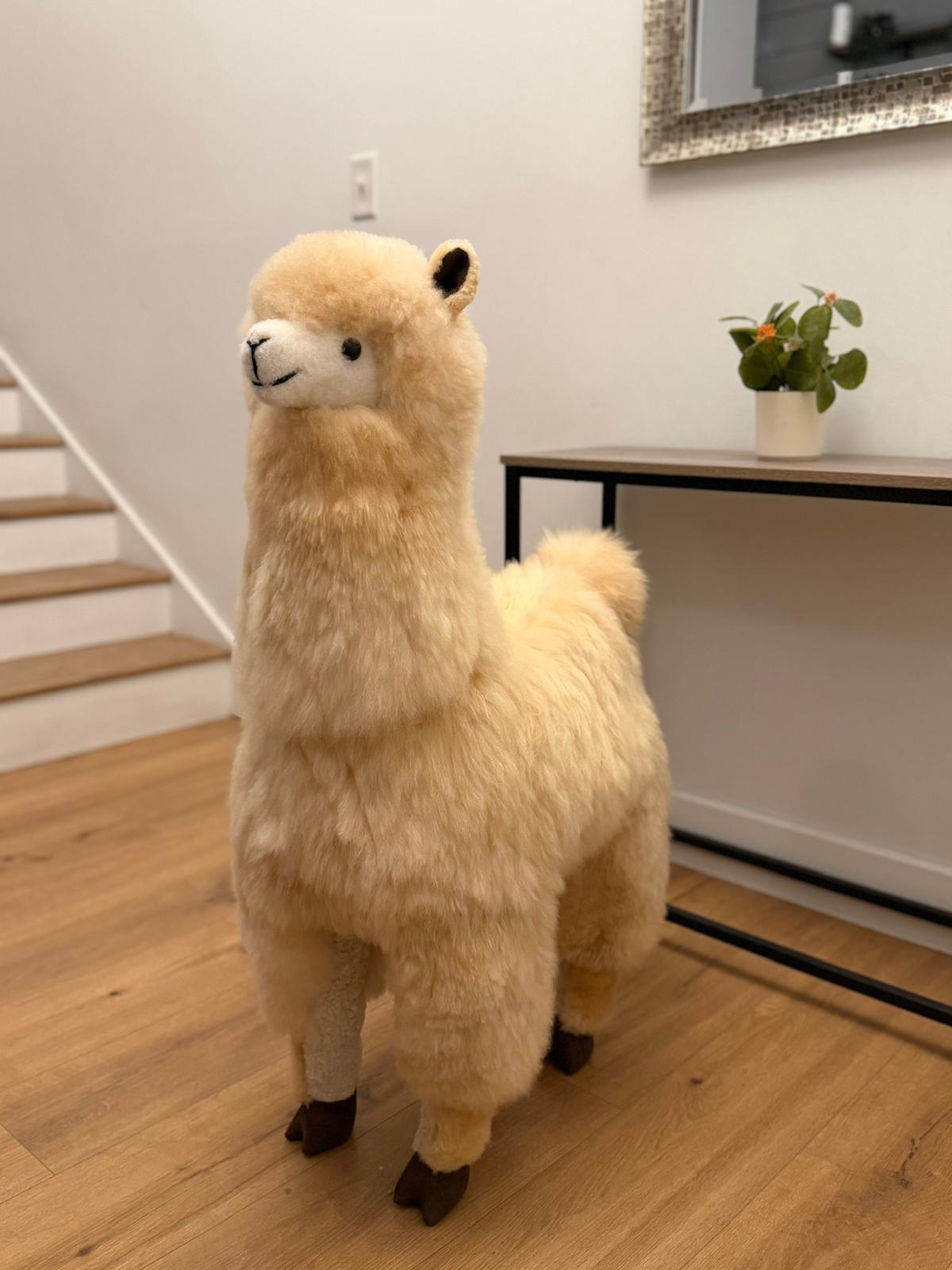 Alpaca ornament made of real alpaca fur. Colors: White & tan Size: 39 inches tall | 1 meter
