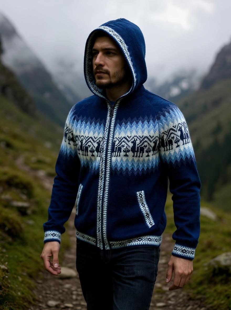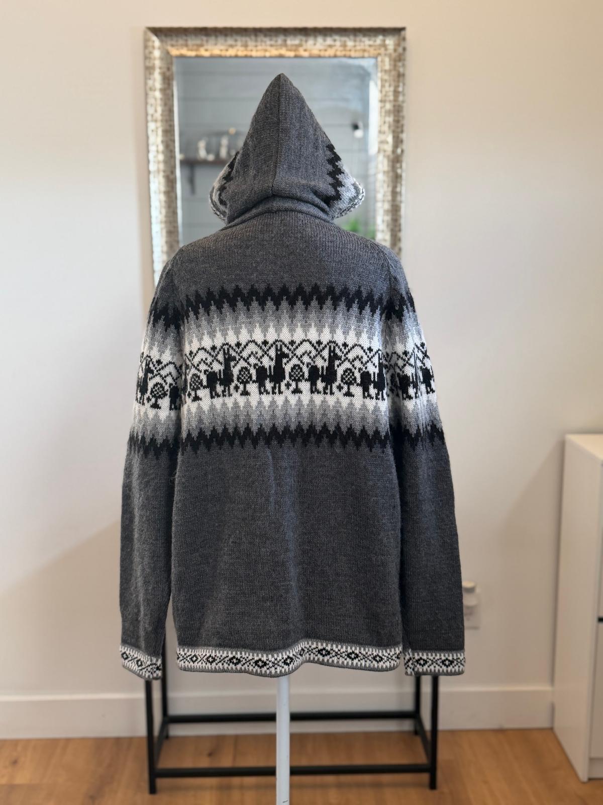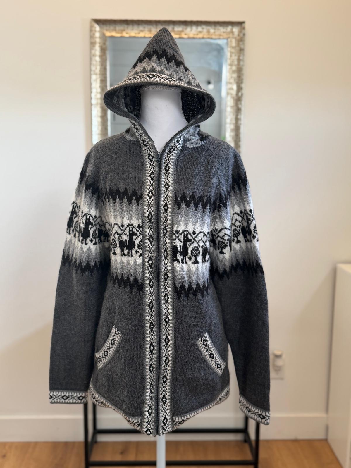 Colors: Brown, blue, dark grey Size: One Size (Standard) Material: Wool with alpaca Zipper and Hoddie